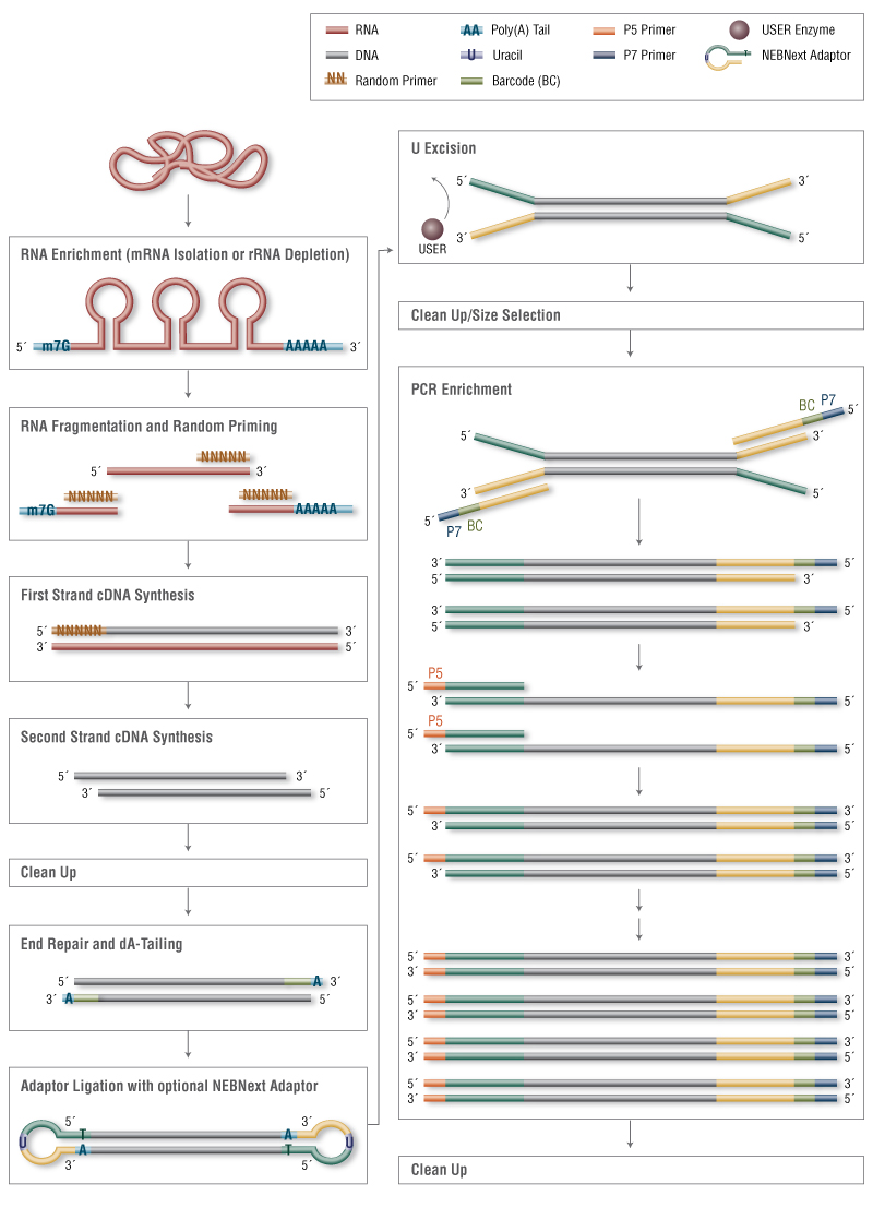 NEBNext® Ultra™ II kits are available for directional (strand-specific) or non-directional RNA library preparation. These kits utilize streamlined workflows and novel master mixes, and have been designed for performance with input amounts as low as 5 ng Total RNA. Modules, including for rRNA Depletion and poly(A) mRNA enrichment, offer the user the ability to customize sample preparation. Adaptors and primers (NEBNext Oligos) are supplied separately, for maximum flexibility. For microRNAs and other small RNAs, our novel Small RNA workflow has been optimized to minimize adaptor-dimers, while producing high-yield, high-density libraries. The NEBNext® Ultra™ II Directional RNA Library Prep Kit for Illumina® (E7760S/L) uses the dUTP method and a streamlined workflow to generate high yield, high quality strand-specific libraries. The NEBNext® Ultra™ II RNA Library Prep Kit for Illumina® (E7770S/L) enables production of non-directional libraries using a streamlined workflow.